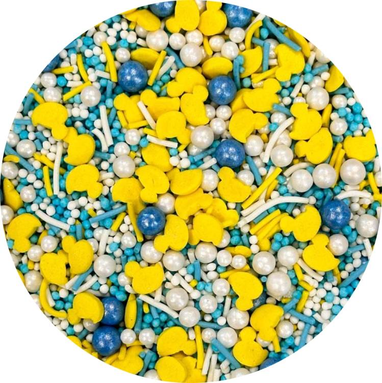 Cukrová dekorace v podobě směsi žlutých konfet, bílých a modrých perleťových perel, modrého a bílého máčku a bílých a modrých tyčinek. Použití: Vhodné na zdobení drobného cukroví např. vánočního nebo svatebního, dortových lízátek či nanuků, zákusků, řezů, dortů, pralinek a muffinů. Dekorace je umístěna v praktických průhledných dózičkách, které zaručí bezpečné a přehledné uskladnění.Složení: bílý cukr, pšeničná mouka, škrob, melasa, rafinovaný palmový olej, modifikovaný škrob, zahušťovadla E412, E415, E466, E414, mastek, leštící látka Capol, barviva E102, E132, E133, E170, E174 Nutriční hodnoty ve 100 g: energie 1699,84 kJ/406 kcal, tuky 5,5 g (z toho nasycené 1,5 g), sacharidy 92 g (z toho cukry 89 g), bílkoviny 2 g, sůl 0,01 g EAN: 2025000009271