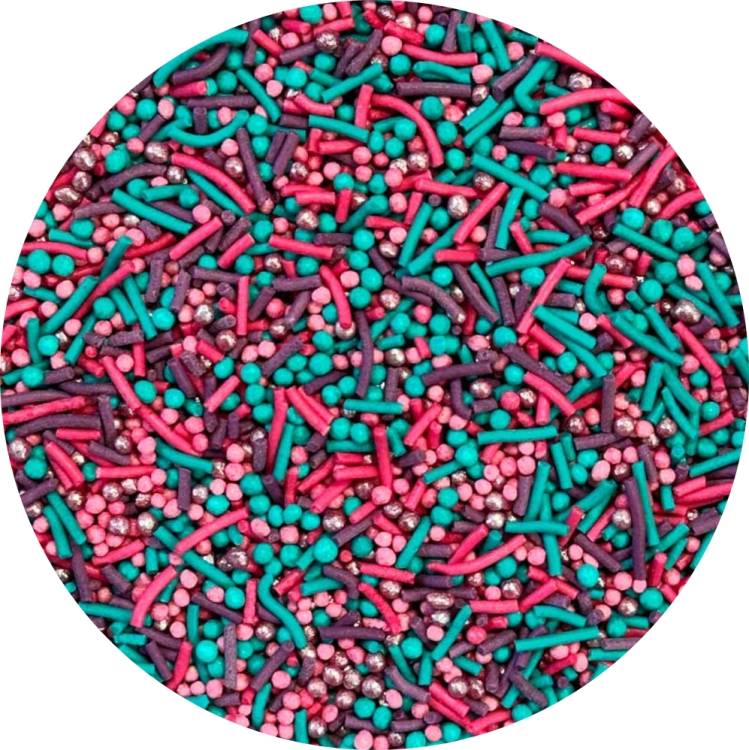 Cukrová dekorace v podobě směsi růžového, tyrkysového a růžového perleťového máčku a malinových růžových, fialových a tyrkysových tyčinek. Použití: Vhodné na zdobení drobného cukroví např. vánočního nebo svatebního, dortových lízátek či nanuků, zákusků, řezů, dortů, pralinek a muffinů. Dekorace je umístěna v praktických průhledných dózičkách, které zaručí bezpečné a přehledné uskladnění.Složení: bílý cukr, pšeničná mouka, škrob, melasa, mastek, leštící látka Capol, rafinovaný palmový olej, modifikovaný škrob, zahušťovadla E415, E412, E466, stříbrný lesk, barviva E102, E122, E132, E133, E174 Nutriční hodnoty ve 100 g: energie 1570 kJ/375 kcal, tuky 5,5 g (z toho nasycené 1,5 g), sacharidy 90 g (z toho cukry 87 g), bílkoviny 4,5 g, sůl 0,01 g EAN: 2025000005075