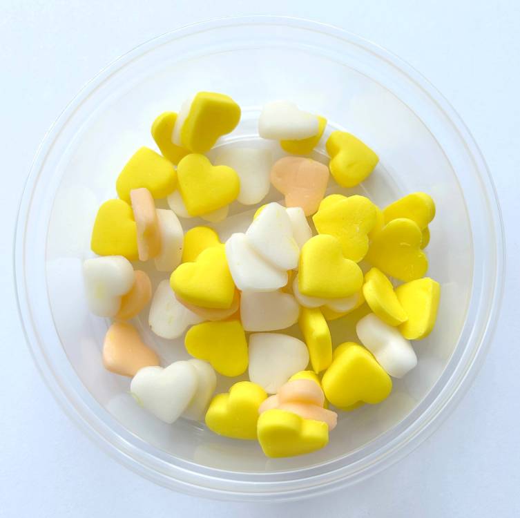 DOPORUČUJEME OSOBNÍ ODBĚR V NA POBOČKÁCH. V BALÍCÍCH POSÍLÁME NA VLASTNÍ RIZIKO!Rozměr: 1,5 cm Balení obsahuje 50 ks. Složení: cukr (EU)(min. 71%), modifikovaný škrob (E1422), voda, glukózový sirup, rostlinný olej (palmový), zahušťovadlo: xanthanová guma (E415), konzervant: sorban draselný (E202), vanilkové aroma, kyselina: kyselina citronová (E330), barviva: Tartrazin (E102), Žluť SY (E110) Nutriční hodnoty ve 100 g: energie 1662 kJ/390 kcal, tuky 5,81 g (z toho nasycené 2,91 g), sacharidy 84,56 g (z toho cukry 76,88 g), bílkoviny 0,004 g, sůl 0,01 g EAN: 2025000009202