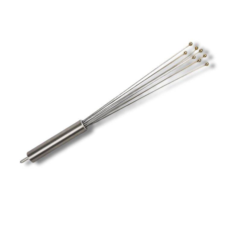 Kovová metla na šlehání s kuličkami je praktický pomocník pro rychlé a efektivní šlehání krémů, těst i vajec. Díky speciálním zakončením šlehá suroviny rychleji a důkladněji.Kovová metla na šlehání s kuličkami je ideálním nástrojem do každé kuchyně pro snadnou a rychlou přípravu krémů, těst, polev nebo šlehaných vajec. Díky inovativní konstrukci s kovovými kuličkami na koncích drátů dochází k efektivnějšímu provzdušnění směsi, což urychluje šlehání a zajišťuje hladší výslednou konzistenci. Metla je vyrobena z kvalitní nerezové oceli, která je odolná, hygienická a snadno se udržuje. Ergonomická rukojeť zajišťuje pohodlný úchop při práci, ať už připravujete lehké krémy nebo hutnější těsta. Díky své délce přibližně 43,5 cm je vhodná i pro práci ve větších miskách nebo gastro provozech. Skvěle se hodí jak pro domácí pečení, tak pro profesionální použití. Vlastnosti: kovová metla s kuličkami pro efektivnější šlehání rychlejší provzdušnění a hladší konzistence kvalitní nerezová ocel ergonomická rukojeť pro pohodlné použití vhodná pro domácí i profesionální kuchyni Spolehlivý pomocník, který vám usnadní každodenní práci v kuchyni a zrychlí přípravu vašich oblíbených receptů. Materiál: kvalitní nerezová ocel Délka: 43,5 cm Foto ilustrační EAN: 5999103148250