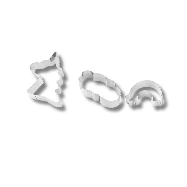 Sada vykrajovátek Jednorožec, duha a mráček pro snadné vykrajování pohádkových tvarů z těsta i fondánu. Ideální pro dětské oslavy a kreativní pečení.Kouzelná sada vykrajovátek s motivy jednorožce, duhy a mráčku promění každé pečení v zábavnou a kreativní činnost. Skvěle se hodí pro přípravu sušenek, perníčků nebo dekorací z fondánu a marcipánu. Vykrajovátka umožňují snadné a přesné vykrojení detailních tvarů, které potěší zejména děti a dodají vašim dezertům hravý, pohádkový vzhled. Jsou ideální pro tematické oslavy, narozeniny nebo sladké tvoření s dětmi. Rozměry: 7,6 - 9 cm Foto ilustrační EAN: 8434581038435