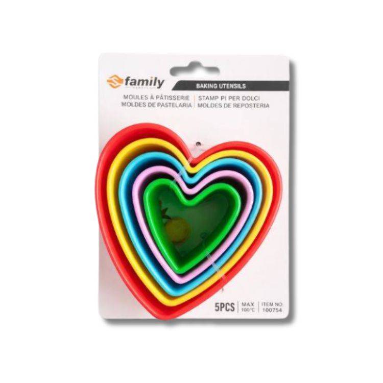 Sada plastových vykrajovátek ve tvaru srdíček je ideální pro tvorbu romantických sušenek, perníčků i fondánových dekorací. Skvělá volba pro svatby, Valentýn i slavnostní pečení.Sada plastových vykrajovátek ve tvaru srdíček vám umožní snadno vytvořit krásné a pravidelné tvary pro vaše sladké i slané dobroty. Díky lehkému plastovému provedení se s vykrajovátky dobře pracuje a jsou vhodná i pro pečení s dětmi. Vykrajovátka jsou ideální pro vykrajování sušenek, perníčků i dekorací z fondánu, marcipánu nebo modelovací hmoty. Různé velikosti srdíček umožňují kreativní vrstvení a zdobení podle vlastní fantazie. Materiál: plast Rozměry: 4,5 cm, 5,5 cm, 6,5 cm, 7,5 cm a 8,5 cm EAN: 8434581007547