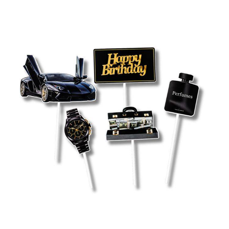 Stylové zápichy s motivem luxusu (auto, hodinky, parfém) dodají dortu moderní a elegantní vzhled.Sada zápichů do dortu v luxusním stylu je ideální pro oslavy, kde chcete vytvořit moderní a výrazný vizuální efekt. Motivy jako sportovní auto, elegantní hodinky a parfém symbolizují styl, úspěch a výjimečnost. Zápichy se snadno zapichují do dortu a díky kontrastnímu černo-zlatému designu krásně vyniknou na světlých i tmavých dortech. Perfektní volba pro narozeninové oslavy, pánské dorty i tematické party. Výška Happy Birthday: 18 cm (5,5 cm bez zapichovací části) Foto ilustrační EAN: 8422017623218