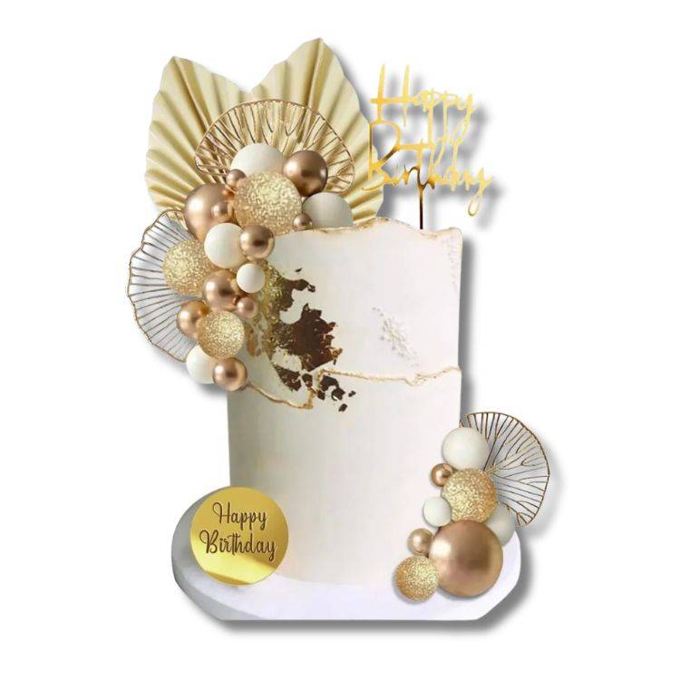 Luxusní zápich do dortu s nápisem Happy Birthday doplněný zlatými listy a dekorativními koulemi. Elegantní ozdoba, která dodá dortu slavnostní a prémiový vzhled.Ozdobte narozeninový dort stylově pomocí tohoto elegantního zápichu Happy Birthday ve zlatém provedení. Kombinace jemných listů a lesklých koulí vytváří harmonickou a luxusní dekoraci, která se skvěle hodí jak pro dětské oslavy, tak i pro dospělé narozeniny či slavnostní příležitosti. Zápichy jsou lehké, snadno se zapichují a okamžitě dodají dezertům finální efektní vzhled bez složitého zdobení. Sada obsahuje: 29 ks Foto ilustrační EAN: 6983730905996