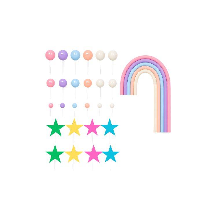 Zápich do dortu s motivem duhy, hvězd a barevných koulí pro snadné a efektní zdobení dortů na narozeniny i dětské oslavy.Vytvořte během chvilky krásně ozdobený dort s tímto dekorativním zápichem s motivem duhy, hvězd a barevných koulí. Kombinace jemných i výrazných barev dodá dortu hravý a moderní vzhled, který se skvěle hodí na narozeninové oslavy, baby shower nebo tematické párty. Zápichy stačí jednoduše zapíchnout do hotového dortu – bez složitého zdobení tak dosáhnete profesionálního efektu. Díky různým velikostem a tvarům vytvoříte na dortu zajímavou kompozici a originální vzhled. Sada obsahuje: 26 ks EAN: 8804670906677