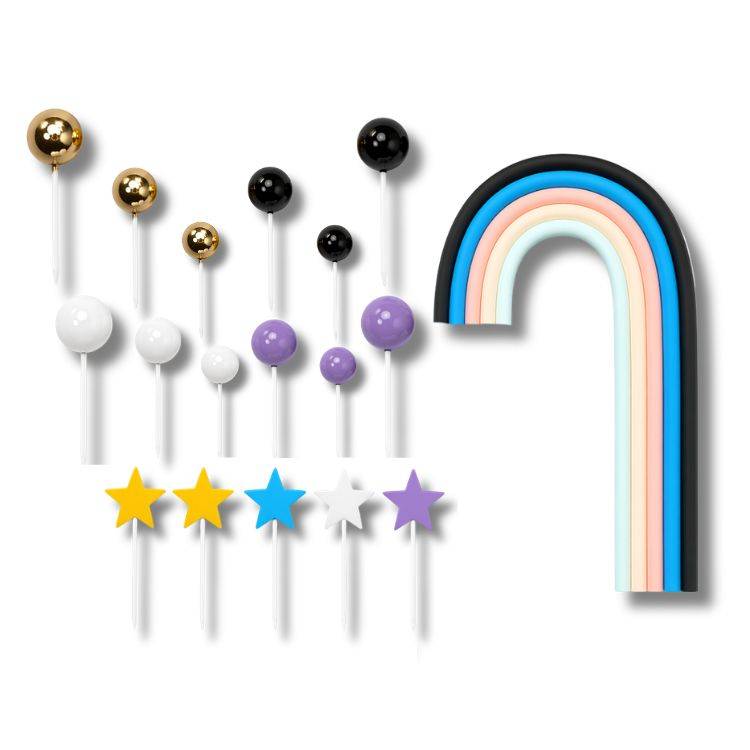 Zápich do dortu s motivem duhy, hvězd a barevných koulí pro snadné a efektní zdobení dortů na narozeniny i dětské oslavy.Vytvořte během chvilky krásně ozdobený dort s tímto dekorativním zápichem s motivem duhy, hvězd a barevných koulí. Kombinace jemných i výrazných barev dodá dortu hravý a moderní vzhled, který se skvěle hodí na narozeninové oslavy, baby shower nebo tematické párty. Zápichy stačí jednoduše zapíchnout do hotového dortu – bez složitého zdobení tak dosáhnete profesionálního efektu. Díky různým velikostem a tvarům vytvoříte na dortu zajímavou kompozici a originální vzhled. Sada obsahuje: 26 ks Foto ilustrační EAN: 8804670906714