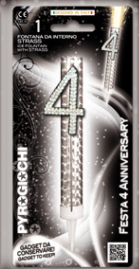 Dortová fontána číslo 4 Rozměr fontány : výška 12 cm + 2,5 cm zápich Rozměr čísla : výška 5 cm Doba hoření : 50 sec. Elegantní dortová fontána číslo 4 se štrasovým designem. Narozeninovou oslavu doporučujeme doplnit o stříbrné narozeninové dekorace, vystřelovací konfety popř. létajícím balónky s heliem. Krásný doplňkem můžou být fóliové balónky čísla anebo fóliové balónky s českým nápisem. Nezapomeňte, že si u nás můžete objednat balónky s fotkou oslavence anebo narozeninové balónky s nápisem dle Vašeho přání.