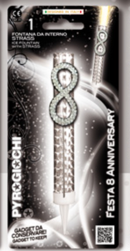 Dortová fontána číslo 8 Rozměr fontány : výška 12 cm + 2,5 cm zápich Rozměr čísla : výška 5 cm Doba hoření : 50 sec. Elegantní dortová fontána číslo 8 se štrasovým designem. Narozeninovou oslavu doporučujeme doplnit o stříbrné narozeninové dekorace, vystřelovací konfety popř. létajícím balónky s heliem. Krásný doplňkem můžou být fóliové balónky čísla anebo fóliové balónky s českým nápisem. Nezapomeňte, že si u nás můžete objednat balónky s fotkou oslavence anebo narozeninové balónky s nápisem dle Vašeho přání.