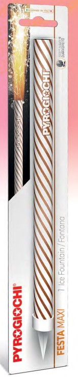 Dortová fontána maxi 25 cm Domácí dortová fontána maxi. Fontánu stačí zapíchnout do dortu špičkou a horní okraj zapálit. Fontána vytvoří efekt zářících a chrlících jisker.Fontány vytvářejí jedinečnou atmosféru. Fontány se objevily na našem trhu nedávno. Ale ihned si získaly velkou oblibu. Různé možnosti využití a designu dělají z tohoto produktu skvělý doplněk každé oslavy. Pro větší oslavence se určite hodí fontána s číslovkou narozenin. Jako další doplňky můžete využít "vystřelovací konfety" anebo "ohňostroje". Další informace a videoukázky těchto produktů najdete na www.vystrelovaci-konfety.cz Rozměr fontány : výška 25 cm + 2,5 cm zápich Doba hoření : 70 sec. Pyrotechnika 1 kategorie.