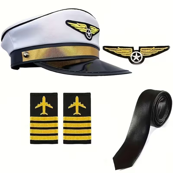 Karnevalový doplněk – čepka letecký kapitán + doplňky kravata a nášivky. Skvěle doplní maškarní kostým pilota nebo na stylovou tématickou párty.