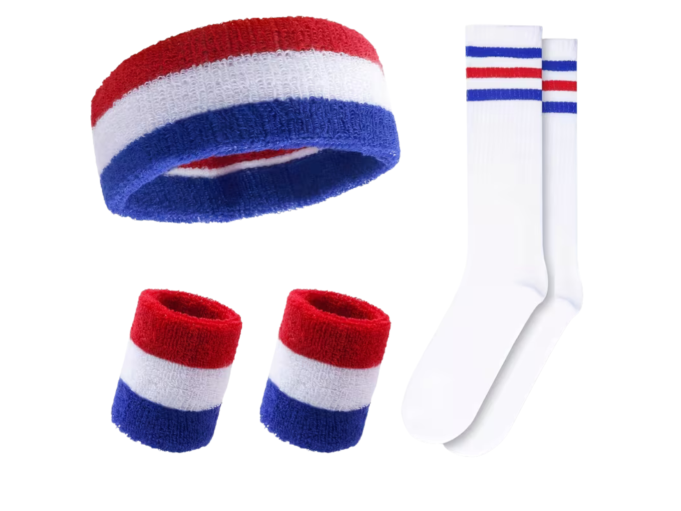 Retro sada potítek na ruce, čelenka a ponožky v barvě trikolory.