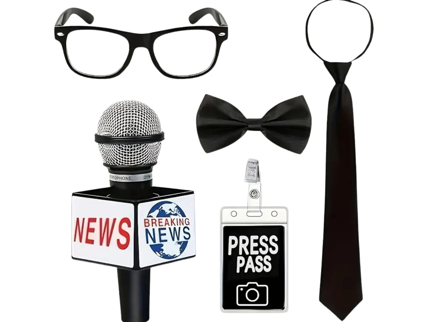 S touto sadou se stáváš hvězdou každé karnevalové show! Sada reportér – novinář obsahuje vše, co správný žurnalista potřebuje: stylový mikrofon, brýle á la investigativní eso, elegantní motýlek i kravatu a samozřejmě visačku s identitou „PRESS“.