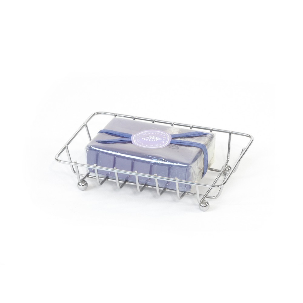 Obdélníková miska na mýdlo z chromovaného drátu. Nohy jsou chráněny plastem.