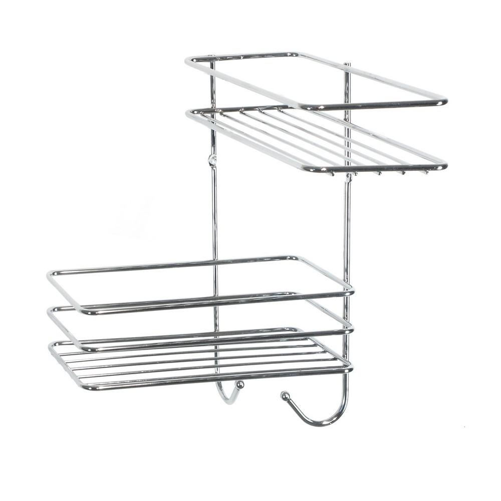 Dvojitá, rohová koupelnová polička s originálním designem. Speciální uspořádání policových košů umožňuje umístit na něj vyšší příslušenství. Ve spodní části má dva praktické háčky. Šrouby a hmoždinky pro montáž jsou součástí sady.