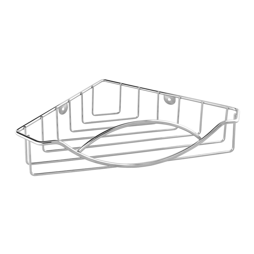 Jednoduchá rohová koupelnová polička z chromovaného drátu. Šrouby a hmoždinky součástí sady.