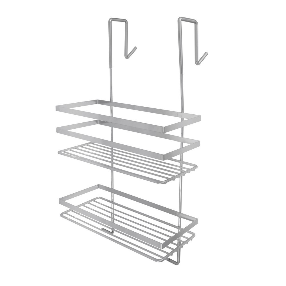 Dvojitá koupelnová polička upevněná na dvou hácích. Vhodné pro montáž na sprchový kout.