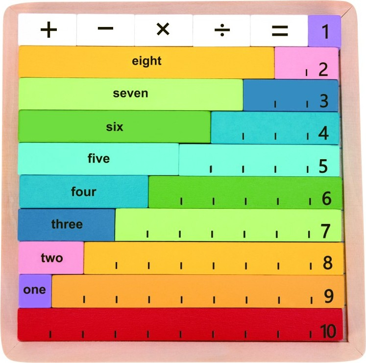 Dřevěná hra – skládačka počítání – obsahuje desku a kostičky, které mohou pomoci při prvním počítání. Hra je ve veselých barvách.