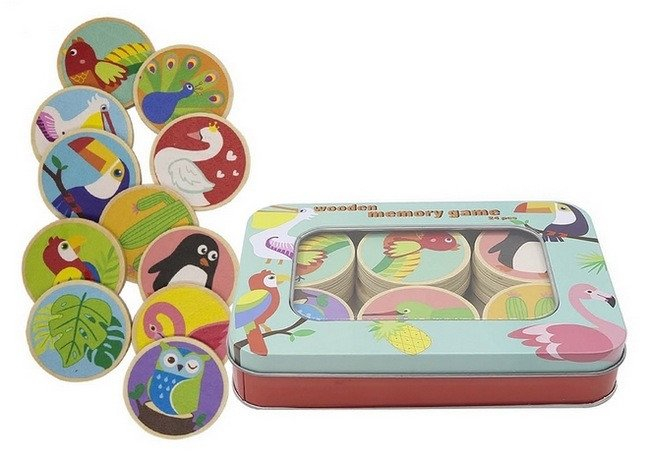Dřevěná paměťová hra s barevnými ptáčky je milá a zároveň chytrá hra, která rozvíjí paměť, soustředění a logické myšlení dětí od 2 let. S pomocí dřevěných žetonů s krásnými ilustracemi ptáků si děti procvičují pozornost a učí se rozpoznávat tvary, barvy i vzory hravou formou.Jak se hraje?Ve hře jde o hledání dvojic. Hráči si postupně otáčejí žetony a snaží se zapamatovat, kde se který ptáček skrývá. S každým úspěšným spojením se trénuje nejen paměť, ale i radost ze zvládnutého úkolu. Hra je vhodná i pro první seznamování s barvami a slovy. Obsah balení: 24 dřevěných žetonů s ilustracemi1 kovová krabička na uložení