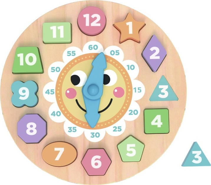 Dřevěné hodiny s vkládacími geometrickými tvary (na kterých jsou číslice) a otočnou malou a velkou ručičkou. Děti si procvičí hodiny, minuty, učí se rozeznat jednotlivé barvy a tvary, určovat a nastavovat správný čas. Díky této hračce bude pro děti jednodušší představit si, kdy mají jít spát, kdy je čas oběda nebo kdy si mohou hrát. Balení obsahuje 15 dřevěných dílků. Rozměr krabice: 23 × 23 × 5 cm Výrobek obsahuje nevyměnitelné baterie.