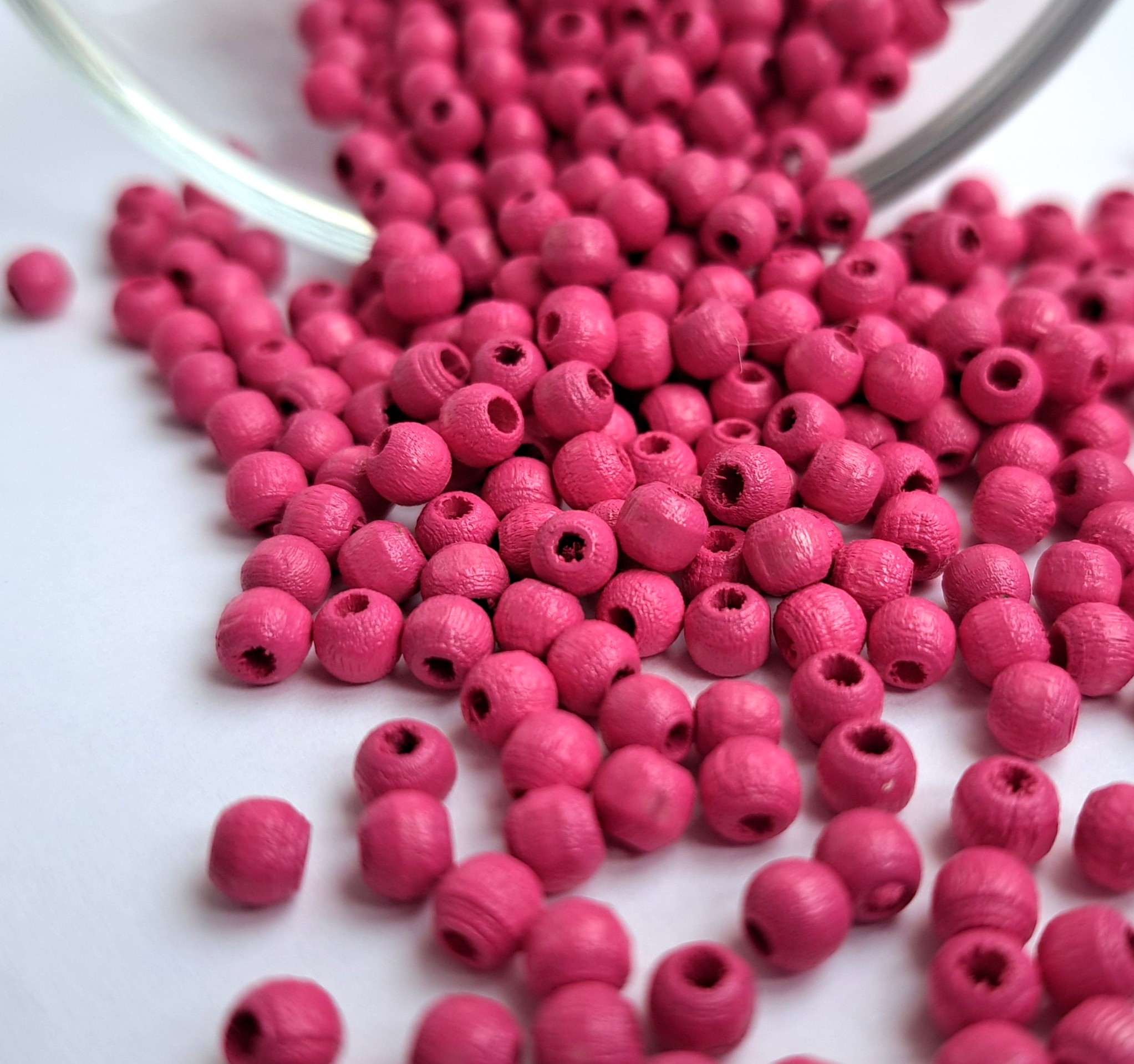 Dřevěné korálky – růžové, 4 mm (10 ks) Krásné dřevěné korálky ve středně růžovém provedení, které zaujmou svým přirozeným původem a precizním zpracováním. I přes přírodní materiál jsou korálky výjimečně jednotné a kvalitní. Průměr: 4 mm Průvlek: ~ 1 mm – vhodný pro širokou paletu návlekových materiálů Materiál: dřevo – barveno bezpečnými barvami určenými na dětské hračky Balení: 10 kusů Původ: Vyrobeno v České republice Ideální pro výrobu přírodních šperků, dětských projektů, dekorací nebo macramé. Přírodní krása a kvalita v jednom!