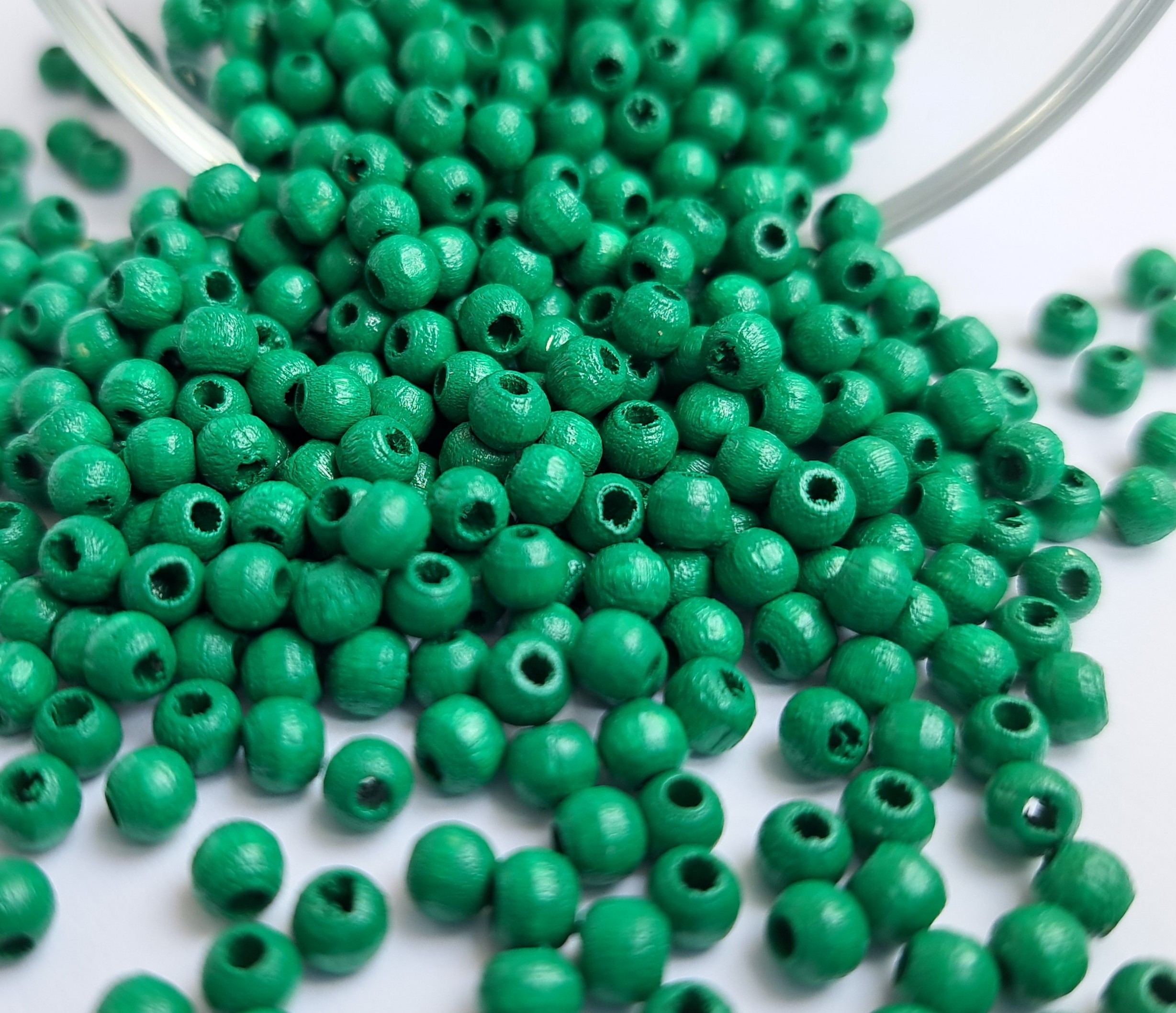 Dřevěné korálky – tmavě zelené, 4 mm (10 ks) Krásné dřevěné korálky v tmavě zeleném provedení, které zaujmou svým přirozeným původem a precizním zpracováním. I přes přírodní materiál jsou korálky výjimečně jednotné a kvalitní. Průměr: 4 mm Průvlek: ~ 1 mm – vhodný pro širokou paletu návlekových materiálů Materiál: dřevo – barveno bezpečnými barvami určenými na dětské hračky Balení: 10 kusů Původ: Vyrobeno v České republice Ideální pro výrobu přírodních šperků, dětských projektů, dekorací nebo macramé. Přírodní krása a kvalita v jednom!