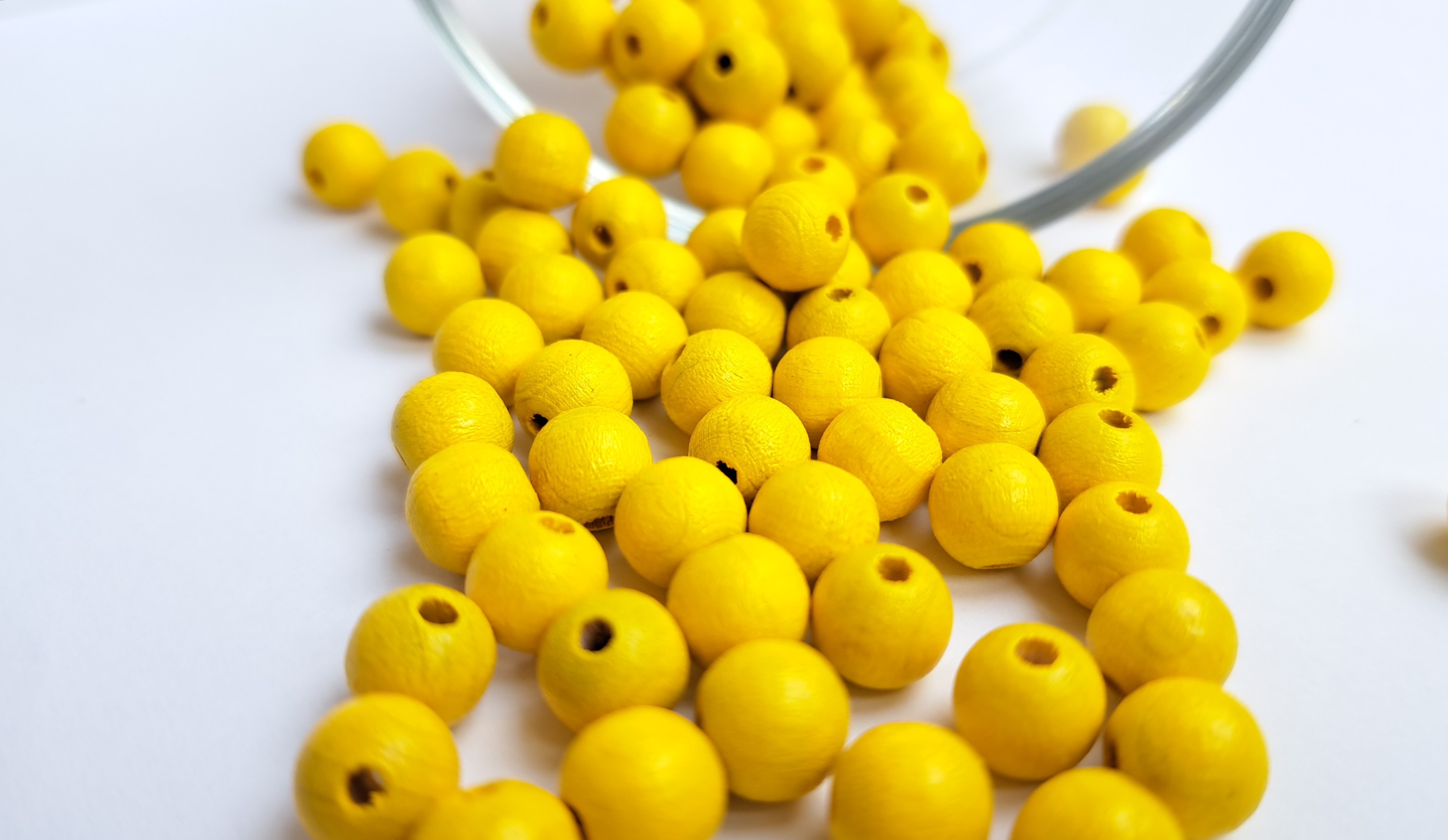 Dřevěné korálky – žluté, 8 mm (10 ks) Krásné dřevěné korálky ve žlutém provedení, které zaujmou svým přirozeným původem a precizním zpracováním. I přes přírodní materiál jsou korálky výjimečně jednotné a kvalitní. Průměr: 8 mm Průvlek: ~ 1,5 mm – vhodný pro širokou paletu návlekových materiálů Materiál: dřevo – barveno bezpečnými barvami určenými na dětské hračky Balení: 10 kusů Původ: Vyrobeno v České republice Ideální pro výrobu přírodních šperků, dětských projektů, dekorací nebo macramé. Přírodní krása a kvalita v jednom!