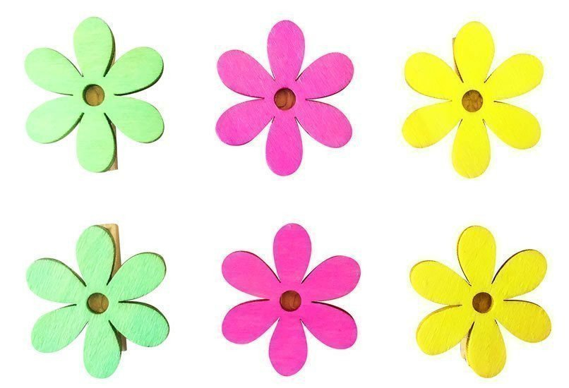 Dřevěné kytičky v jarních barvách. Díky kolíčku se dají všestranně použít, například krásně ozdobí jarní věnce.