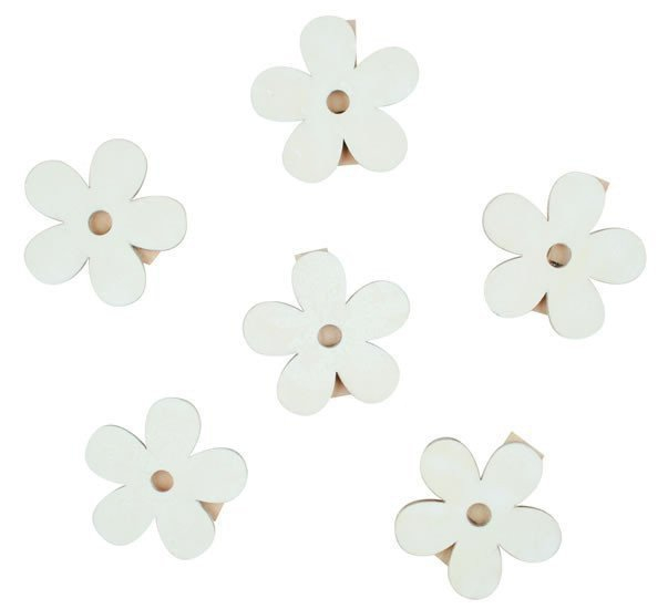 Dřevěné kytičky v bílé barvě. Díky kolíčku se dají všestranně použít, například krásně ozdobí jarní věnce.