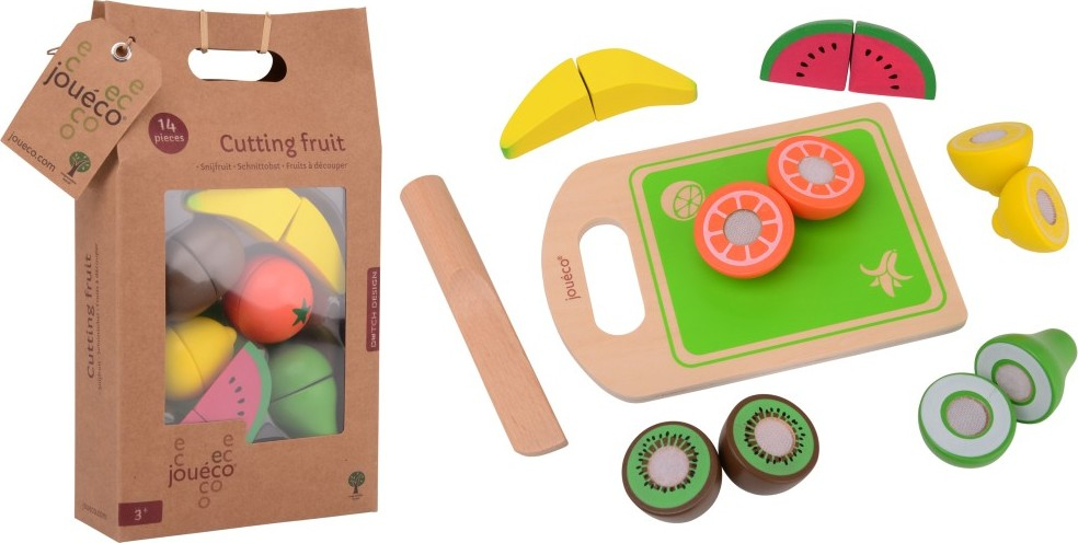 Dřevěná sada – ovoce s prkénkem a nožíkem. Sada obsahuje 7 ks – meloun, banán, pomeranč, citron, hrušku, prkénko a nožík. Ovoce je opatřeno magnetem – lze lechce rozřítnout a poté opět spojit. Kvalitní dřevěná hračka vyrobena z masivního bukového dřeva. Použity zdravotně nezávadné barvy.