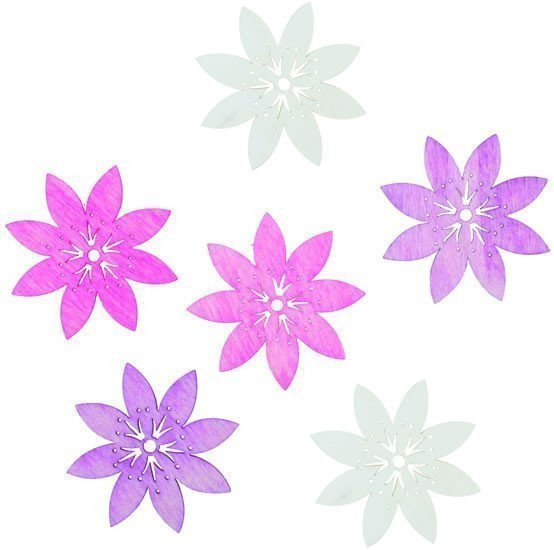 Dřevěné kytičky v růžové, fialové a bílé barvě jsou určeny k vytváření dekorací.