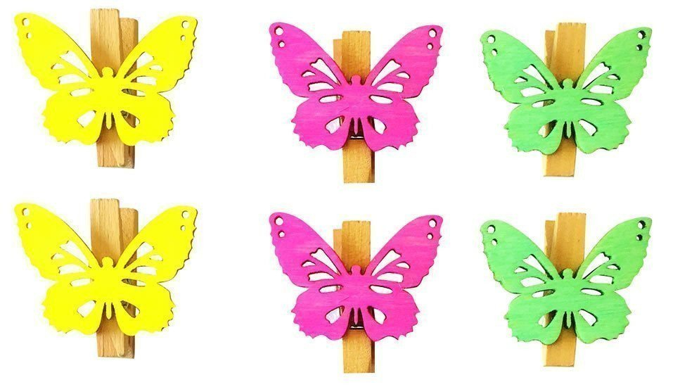 Dřevění motýlci v jarních barvách. Díky kolíčku se dají všestranně použít, například krásně ozdobí jarní věnce.