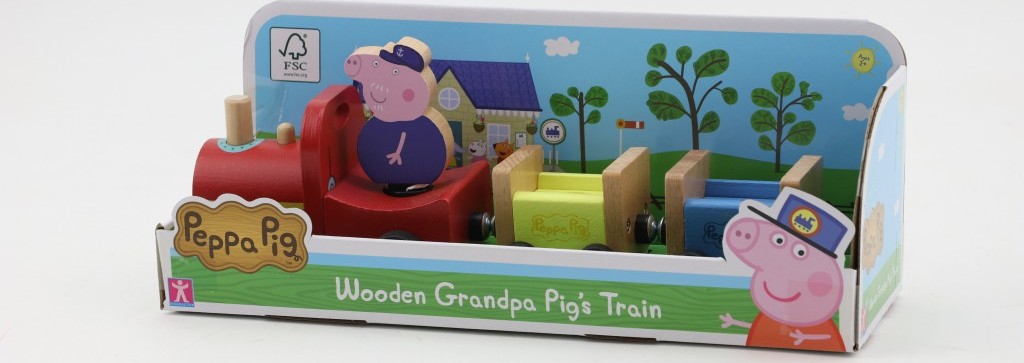 Dřevěný vlak Prasátko Peppa + figurka děda – zahraj si s dřevěným vláčkem, který řídí Děda Pig, najdeš v něm místa jště pro další 2 figurky. Vlak má lokomotivu a dva vagonky.