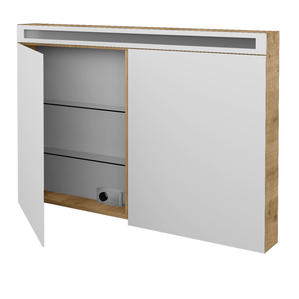 Zrcadlové skříně jsou oblíbené, elegantní a především velmi praktické. V Dřevojasu jsme se při jejich výrobě zaměřili na to, aby vám v zpříjemnily osobní hygienu a celkově zjednodušily život v koupelně. A přesně toto umí galerky řady AIR. Parametry galerky Zrcadlová skříňka AIR GA2OE 120 je vyrobena ve dvoudveřovém provedení s oboustrannými zrcadly. Ta jsou ke korpusu připevněna pomocí značkových pantů Grass, které jsou k zrcadlům přichyceny pomocí speciální, patentem chráněné a v Dřevojasu zkonstruované, kovové lišty. Vnitřek galerky Vnitřní uspořádání galerky AIR je řešeno šesti poličkami vyrobenými z pevného skla. Tyto poličky lze umístit v šesti různých výškově nastavitelných pozicích. LED osvětlení LED osvětlení o výkonu 24,8 W je umístěno v horní části galerky, za zrcadlovou lištou s propískovaným sklem. Světlo se ovládá vypínačem ve spodní části vnitřku galerky, kde je také k dispozici externí i elektrická zásuvka (230 V). Galerka splňuje krytí IP 44. Povrchové úpravy Zrcadlovou skříňku AIR GA2OE 120 lze vyrobit v celé řadě povrchových úprav. Vybrat si můžete z mnoha dekorů, dřevodekorů laků (provedení lesk/mat) nebo možnost Individual dle vzorníku RAL/NCS. Přednosti galerky: Na galerku se vztahuje naše prodloužená záruka 5 let. Díky svému minimalistickému designu se galerka hodí k jakékoliv umyvadlové skříňce. Materiál korpusu je vyroben z kvalitních LTD desek. Galerka je vybavena úsporným LED osvětlením s výkonem 24,8 W. Oboustranné zrcadlo usazeno na značkových pantech. Dvířka jsou vybavena zrcadlovou lištou chráněnou patentem.