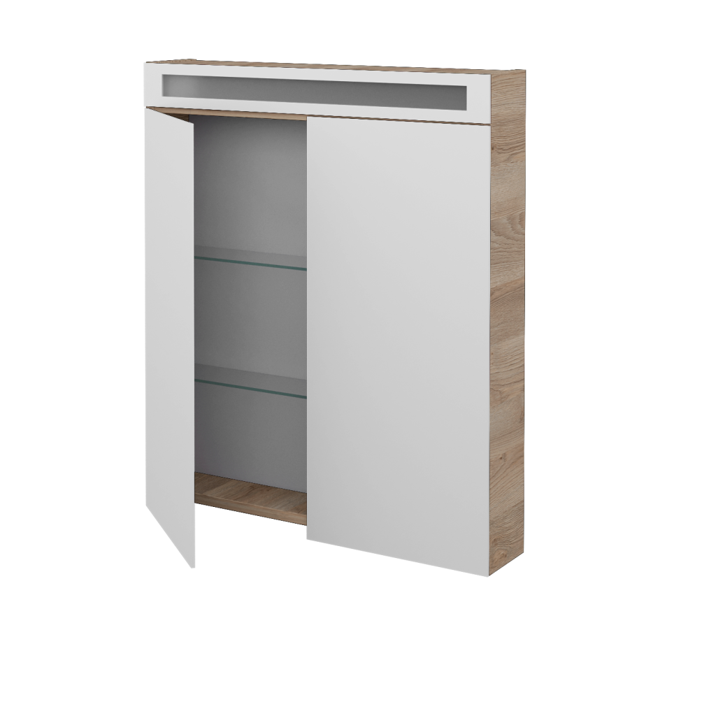 Zrcadlové skříně jsou oblíbené, elegantní a především velmi praktické. V Dřevojasu jsme se při jejich výrobě zaměřili na to, aby vám v zpříjemnily osobní hygienu a celkově zjednodušily život v koupelně. A přesně toto umí galerky řady AIR. Parametry galerky Zrcadlová skříňka AIR GA2OE 70 je vyrobena ve dvoudveřovém provedení s oboustrannými zrcadly. Ta jsou ke korpusu připevněna pomocí značkových pantů Grass, které jsou k zrcadlům přichyceny pomocí speciální, patentem chráněné a v Dřevojasu zkonstruované, kovové lišty. Vnitřek galerky Vnitřní uspořádání galerky AIR je řešeno dvěma poličkami vyrobenými z pevného skla. Tyto poličky lze umístit v šesti různých výškově nastavitelných pozicích. LED osvětlení LED osvětlení o výkonu 13,4 W je umístěno v horní části galerky, za zrcadlovou lištou s propískovaným sklem. Světlo se ovládá vypínačem ve spodní části vnitřku galerky, kde je také k dispozici externí i elektrická zásuvka (230 V). Galerka splňuje krytí IP 44. Přednosti galerky: Na galerku se vztahuje naše prodloužená záruka 5 let. Díky svému minimalistickému designu se galerka hodí k jakékoliv umyvadlové skříňce. Materiál korpusu je vyroben z kvalitních LTD desek. Galerka je vybavena úsporným LED osvětlením s výkonem 13,4 W. Oboustranné zrcadlo usazeno na značkových pantech. Dvířka jsou vybavena zrcadlovou lištou chráněnou patentem.
