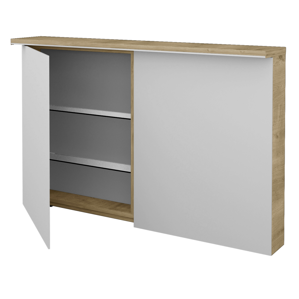 Součástí široké nabídky zrcadlových skříní je i elegantní a prostorná galerka ASTON GA2OE 120 vybavená praktickým LED osvětlením, vypínačem a velkým úložným prostorem. Galerka je díky svým rozměrům vhodná do středně nebo větších koupelen a lze ji kombinovat s jakoukoliv umyvadlovou skříňkou. Parametry galerky Zrcadlová skříňka ASTON GA2OE 120 je konstruována jako dvoudveřová s oboustrannými zrcadly. Ta jsou uchycena ke korpusu pomocí značkových pantů Grass a speciální zrcadlové lišty, která je chráněná českým patentem. Korpus galerky vyrábíme z kvalitních LTD desek a můžete si vybrat z celé řady povrchových úprav. K dispozici jsou krásné dekory, dřevodekory nebo velice elegantní lakované úpravy lesk/mat. Galerku je také možné vyrobit v individuálním provedení dle vzorníku RAL/NCS. Uspořádání Zrcadlová skříňka ASTON GA2OE 120 má prostor rozdělený pomocí čtyř skleněných polic, které lze umístit ve třech výškově nastavitelných pozicích. LED osvětlení Součástí výbavy galerky je také LED osvětlení o výkonu 18 W (LED diody – světelný pásek nelze vyměnit). Oproti modelům galerek AIR a MAX je umístěno v předstupující rampě a zatímco u jmenovaných modelů svítí světlo do prostoru, u této galerky osvětluje prostor kolem hlavně umyvadla. Vypíná se pomocí vypínače ve spodní části galerky, kde je také umístěna i elektrická zásuvka (230 V). Galerka splňuje krytí IP 44. Přednosti: Na zrcadlovou skříňku dáváme prodlouženou záruku 5 let. Úsporné LED osvětlení o výkonu 18 W, které je ovladatelné vypínačem ve spodní části galerky. Součástí výbavy je i elektrická zásuvka. Díky oboustrannému zrcadlu nabízí galerka dvojnásobnou zrcadlovou plochu. Zrcadlová dvířka jsou ke korpusu uchyceny pomocí pantů značky Grass na speciální, patentem chráněné, liště.