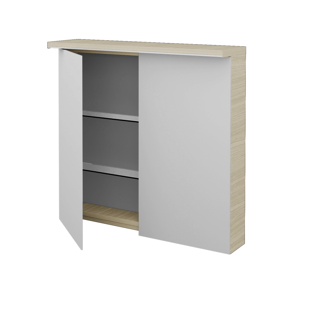 Součástí široké nabídky zrcadlových skříní je i elegantní a prostorná galerka ASTON GA2OE 80 vybavená praktickým LED osvětlením, vypínačem a velkým úložným prostorem. Galerka je díky svým rozměrům vhodná do středně nebo větších koupelen a lze ji kombinovat s jakoukoliv umyvadlovou skříňkou.  Parametry galerky Zrcadlová skříňka ASTON GA2OE 80 je konstruována jako dvoudveřová s oboustrannými zrcadly. Ta jsou uchycena ke korpusu pomocí značkových pantů Grass a speciální zrcadlové lišty, která je chráněná českým patentem. Korpus galerky vyrábíme z kvalitních LTD desek a můžete si vybrat z celé řady povrchových úprav. K dispozici jsou krásné dekory, dřevodekory nebo velice elegantní lakované úpravy lesk/mat. Galerku je také možné vyrobit v individuálním provedení dle vzorníku RAL/NCS. Uspořádání Zrcadlová skříňka ASTON GA2OE 80 má prostor rozdělený pomocí dvou skleněných polic, které lze umístit ve třech výškově nastavitelných pozicích.  LED osvětlení Součástí výbavy galerky je také LED osvětlení o výkonu 12 W (LED diody – světelný pásek nelze vyměnit). Oproti modelům galerek AIR a MAX je umístěno v předstupující rampě a zatímco u jmenovaných modelů svítí světlo do prostoru, u této galerky osvětluje prostor hlavně kolem umyvadla. Vypíná se pomocí vypínače ve spodní části galerky, kde je také umístěna i elektrická zásuvka (230 V). Galerka splňuje krytí IP 44. Přednosti: Na zrcadlovou skříňku dáváme prodlouženou záruku 5 let. Úsporné LED osvětlení o výkonu 12 W, které je ovladatelné vypínačem ve spodní části galerky. Součástí výbavy je i elektrická zásuvka. Díky oboustrannému zrcadlu nabízí galerka dvojnásobnou zrcadlovou plochu. Zrcadlová dvířka jsou ke korpusu uchyceny pomocí pantů značky Grass na speciální, patentem chráněné, liště.