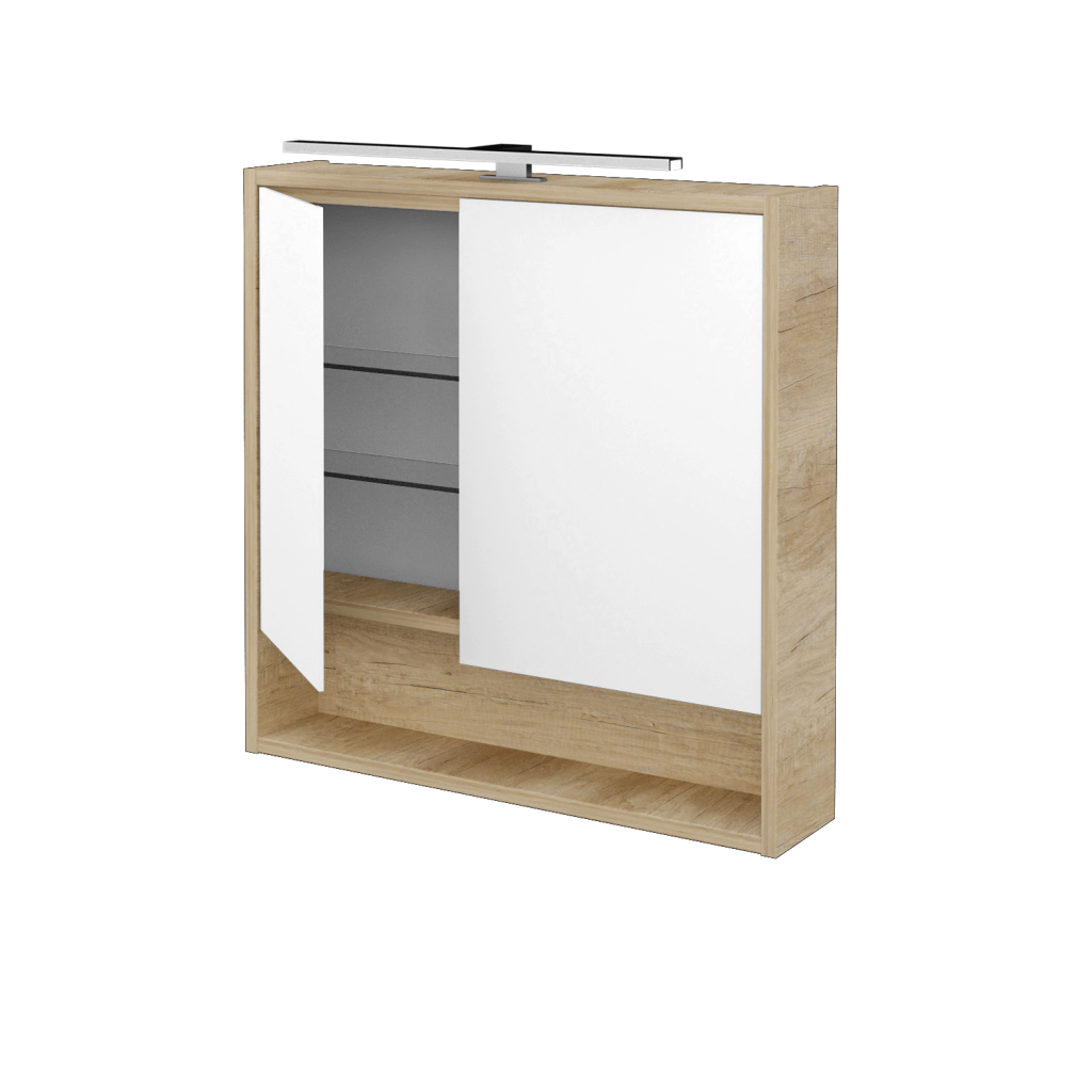 Nová definice prostoru Galerka FOCUS GA2NOE 70 je součástí nové řady galerek FOCUS s ojediněle řešeným úložným prostorem a celou řadou praktických detailů, které vám usnadní život v koupelně.  Parametry galerky Galerka FOCUS GA2NOE 70 s asymetrickým dělením zrcadla (30/40) je konstruována jako dvoudveřová s oboustranným zrcadlem. Vnitřní prostor galerky je rozdělen pomocí 2 skleněných a nastavitelných polic, díky čemuž vzniká praktický prostor pro uložení všech doplňků, jako je kosmetika, hygienické potřeby atd. Velkou výhodou galerky je el. zásuvka 230 V (uvnitř galerky) a vypínač pro LED osvětlení PINO 500 (8 W). Galerka splňuje krytí IP 44. Povrchové zpracování Korpus galerky je možné vyrobit v 18 různých dekorech, v lakovaných provedeních (lesk/mat) nebo v individuální barevnosti dle vzorníku RAL/NCS. Výhody galerky: Maximální zrcadlová plocha díky oboustrannému zrcadlu na dvířkách. Galeka je vybavena elektrickou zásuvkou, vypínačem a LED osvětlením Pino 500. Ve spodní části galerky je praktická otevřená nika.