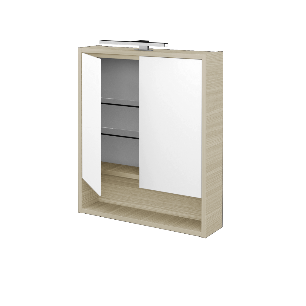 Nová definice prostoru Galerka FOCUS GA2OE 60 je součástí nové řady galerek FOCUS s ojediněle řešeným úložným prostorem a celou řadou praktických detailů, které vám usnadní život v koupelně. Parametry galerky Galerka FOCUS GA2OE 60 je konstruována jako dvoudveřová s oboustranným zrcadlem. Vnitřní prostor galerky je rozdělen pomocí 2 skleněných a nastavitelných polic, díky čemuž vzniká praktický prostor pro uložení všech doplňků, jako je kosmetika, hygienické potřeby atd. Velkou výhodou galerky je el. zásuvka 230 V (uvnitř galerky) a vypínač pro LED osvětlení Pino 300 (5 W, teplota 4 000 K). Galerka splňuje krytí IP 44. Povrchové zpracování Korpus galerky je možné vyrobit v 18 různých dekorech, v lakovaných provedeních (lesk/mat) nebo v individuální barevnosti dle vzorníku RAL/NCS. Výhody galerky: Maximální zrcadlová plocha díky oboustrannému zrcadlu na dvířkách. Galeka je vybavena elektrickou zásuvkou, vypínačem a LED osvětlením Pino 300. Ve spodní části galerky je praktická otevřená nika.