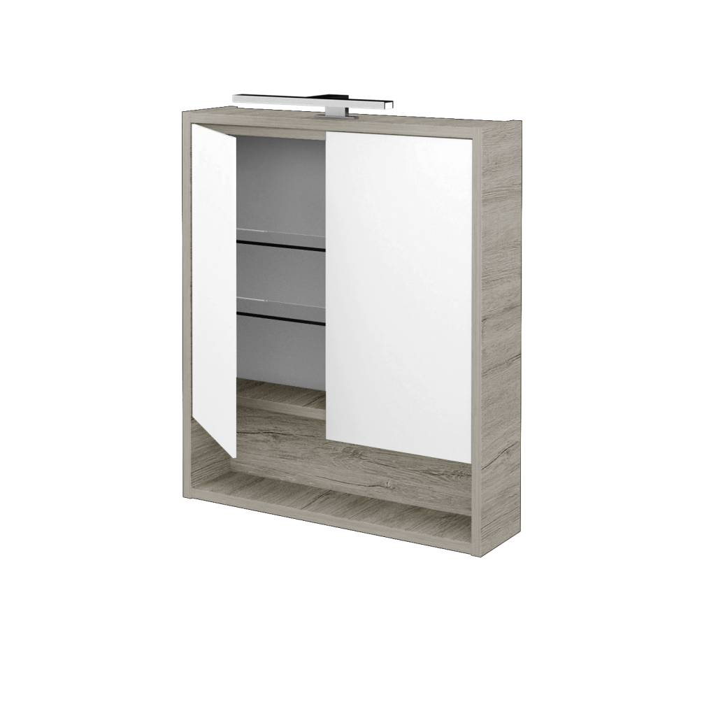 Nová definice prostoru Galerka FOCUS GA2OE 60 je součástí nové řady galerek FOCUS s ojediněle řešeným úložným prostorem a celou řadou praktických detailů, které vám usnadní život v koupelně.  Parametry galerky Galerka FOCUS GA2OE 60 je konstruována jako dvoudveřová s oboustranným zrcadlem. Vnitřní prostor galerky je rozdělen pomocí 2 skleněných a nastavitelných polic, díky čemuž vzniká praktický prostor pro uložení všech doplňků, jako je kosmetika, hygienické potřeby atd. Velkou výhodou galerky je el. zásuvka 230 V (uvnitř galerky) a vypínač pro LED osvětlení Pino 300 (5 W, teplota 4 000 K). Galerka splňuje krytí IP 44. Povrchové zpracování Korpus galerky je možné vyrobit v 18 různých dekorech, v lakovaných provedeních (lesk/mat) nebo v individuální barevnosti dle vzorníku RAL/NCS. Výhody galerky: Maximální zrcadlová plocha díky oboustrannému zrcadlu na dvířkách. Galeka je vybavena elektrickou zásuvkou, vypínačem a LED osvětlením Pino 300. Ve spodní části galerky je praktická otevřená nika.