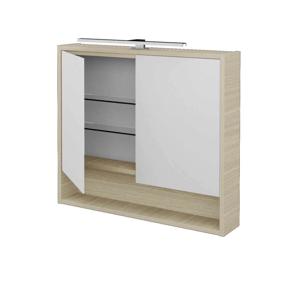 Nová definice prostoru Galerka FOCUS GA2OE 80 je součástí nové řady galerek FOCUS s ojediněle řešeným úložným prostorem a celou řadou praktických detailů, které vám usnadní život v koupelně.  Parametry galerky Galerka FOCUS GA2OE 80 je konstruována jako dvoudveřová s oboustranným zrcadlem. Vnitřní prostor galerky je rozdělen pomocí 2 skleněných a nastavitelných polic, díky čemuž vzniká praktický prostor pro uložení všech doplňků, jako je kosmetika, hygienické potřeby atd. Velkou výhodou galerky je el. zásuvka 230 V (uvnitř galerky) a vypínač pro LED osvětlení Pino 500 (8 W, teplota 4 000 K). Galerka splňuje krytí IP 44. Povrchové zpracování Korpus galerky je možné vyrobit v 18 různých dekorech, v lakovaných provedeních (lesk/mat) nebo v individuální barevnosti dle vzorníku RAL/NCS. Výhody galerky: Maximální zrcadlová plocha díky oboustrannému zrcadlu na dvířkách. Galeka je vybavena elektrickou zásuvkou, vypínačem a LED osvětlením Pino 500. Ve spodní části galerky je praktická otevřená nika.