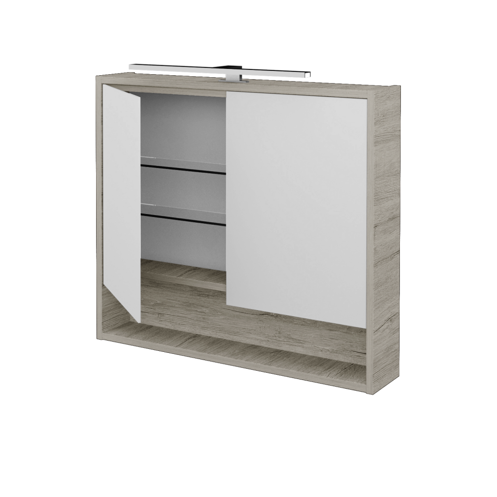 Nová definice prostoru Galerka FOCUS GA2OE 80 je součástí nové řady galerek FOCUS s ojediněle řešeným úložným prostorem a celou řadou praktických detailů, které vám usnadní život v koupelně.  Parametry galerky Galerka FOCUS GA2OE 80 je konstruována jako dvoudveřová s oboustranným zrcadlem. Vnitřní prostor galerky je rozdělen pomocí 2 skleněných a nastavitelných polic, díky čemuž vzniká praktický prostor pro uložení všech doplňků, jako je kosmetika, hygienické potřeby atd. Velkou výhodou galerky je el. zásuvka 230 V (uvnitř galerky) a vypínač pro LED osvětlení Pino 500 (8 W, teplota 4 000 K). Galerka splňuje krytí IP 44. Povrchové zpracování Korpus galerky je možné vyrobit v 18 různých dekorech, v lakovaných provedeních (lesk/mat) nebo v individuální barevnosti dle vzorníku RAL/NCS. Výhody galerky: Maximální zrcadlová plocha díky oboustrannému zrcadlu na dvířkách. Galeka je vybavena elektrickou zásuvkou, vypínačem a LED osvětlením Pino 500. Ve spodní části galerky je praktická otevřená nika.