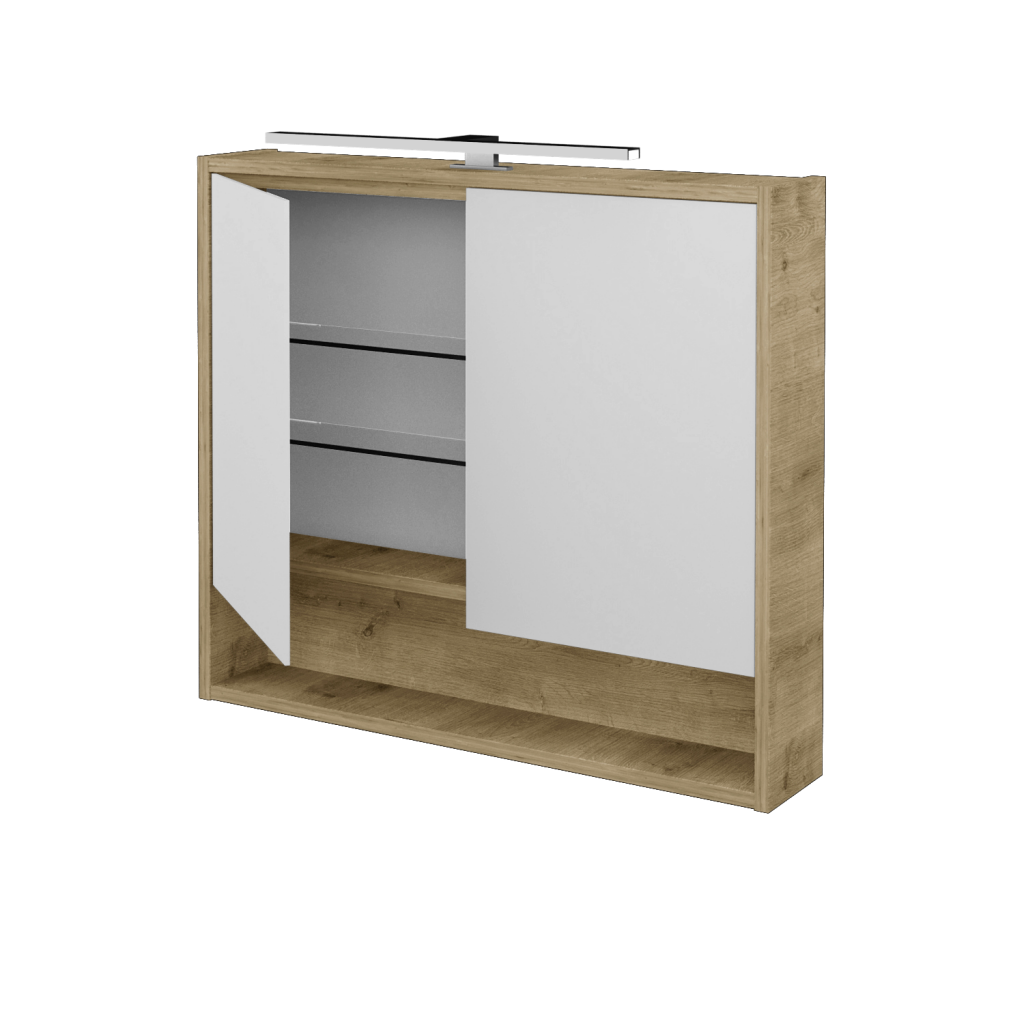 Nová definice prostoru Galerka FOCUS GA2OE 80 je součástí nové řady galerek FOCUS s ojediněle řešeným úložným prostorem a celou řadou praktických detailů, které vám usnadní život v koupelně. Parametry galerky Galerka FOCUS GA2OE 80 je konstruována jako dvoudveřová s oboustranným zrcadlem. Vnitřní prostor galerky je rozdělen pomocí 2 skleněných a nastavitelných polic, díky čemuž vzniká praktický prostor pro uložení všech doplňků, jako je kosmetika, hygienické potřeby atd. Velkou výhodou galerky je el. zásuvka 230 V (uvnitř galerky) a vypínač pro LED osvětlení Pino 500 (8 W, teplota 4 000 K). Galerka splňuje krytí IP 44. Povrchové zpracování Korpus galerky je možné vyrobit v 18 různých dekorech, v lakovaných provedeních (lesk/mat) nebo v individuální barevnosti dle vzorníku RAL/NCS. Výhody galerky: Maximální zrcadlová plocha díky oboustrannému zrcadlu na dvířkách. Galeka je vybavena elektrickou zásuvkou, vypínačem a LED osvětlením Pino 500. Ve spodní části galerky je praktická otevřená nika.