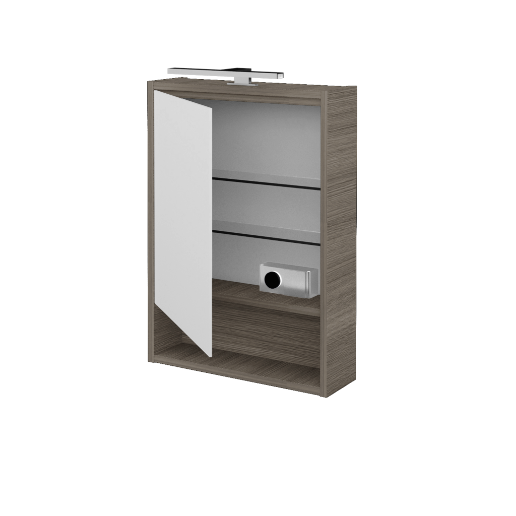 Nová definice prostoru Galerka FOCUS GAOE 50 je součástí nové řady galerek FOCUS s ojediněle řešeným úložným prostorem a celou řadou praktických detailů, které vám usnadní život v koupelně. Parametry Galerka FOCUS GAOE 50 je konstruována jako jednodveřová s oboustranným zrcadlem. Vnitřní prostor galerky je rozdělen pomocí 2 skleněných a nastavitelných polic, díky čemuž vzniká praktický prostor pro uložení všech doplňků, jako je kosmetika, hygienické potřeby atd. Velkou výhodou galerky je el. zásuvka 230 V (uvnitř galerky) a vypínač pro LED osvětlení Pino 300 (5 W, teplota 4 000 K). Galerka splňuje krytí IP 44. U galerky je rovněž možné vybrat, zda chcete pravé nebo levé otevírání. Povrchové zpracování Korpus galerky je možné vyrobit v 18 různých dekorech, v lakovaných provedeních (lesk/mat) nebo v individuální barevnosti dle vzorníku RAL/NCS. Výhody galerky: Možnost volby pravého nebo levého otevírání. Maximální zrcadlová plocha díky oboustrannému zrcadlu na dvířkách. Galeka je vybavena elektrickou zásuvkou, vypínačem a LED osvětlením Pino 300. Ve spodní části galerky je praktická otevřená nika.