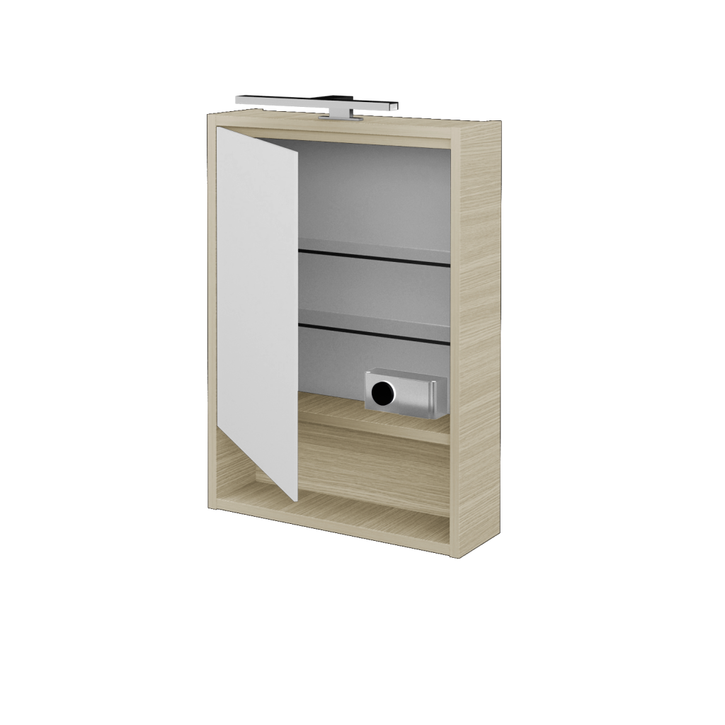 Nová definice prostoru Galerka FOCUS GAOE 50 je součástí nové řady galerek FOCUS s ojediněle řešeným úložným prostorem a celou řadou praktických detailů, které vám usnadní život v koupelně. Parametry Galerka FOCUS GAOE 50 je konstruována jako jednodveřová s oboustranným zrcadlem. Vnitřní prostor galerky je rozdělen pomocí 2 skleněných a nastavitelných polic, díky čemuž vzniká praktický prostor pro uložení všech doplňků, jako je kosmetika, hygienické potřeby atd. Velkou výhodou galerky je el. zásuvka 230 V (uvnitř galerky) a vypínač pro LED osvětlení Pino 300 (5 W, teplota 4 000 K). Galerka splňuje krytí IP 44. U galerky je rovněž možné vybrat, zda chcete pravé nebo levé otevírání. Povrchové zpracování Korpus galerky je možné vyrobit v 18 různých dekorech, v lakovaných provedeních (lesk/mat) nebo v individuální barevnosti dle vzorníku RAL/NCS. Výhody galerky: Možnost volby pravého nebo levého otevírání. Maximální zrcadlová plocha díky oboustrannému zrcadlu na dvířkách. Galeka je vybavena elektrickou zásuvkou, vypínačem a LED osvětlením Pino 300. Ve spodní části galerky je praktická otevřená nika.