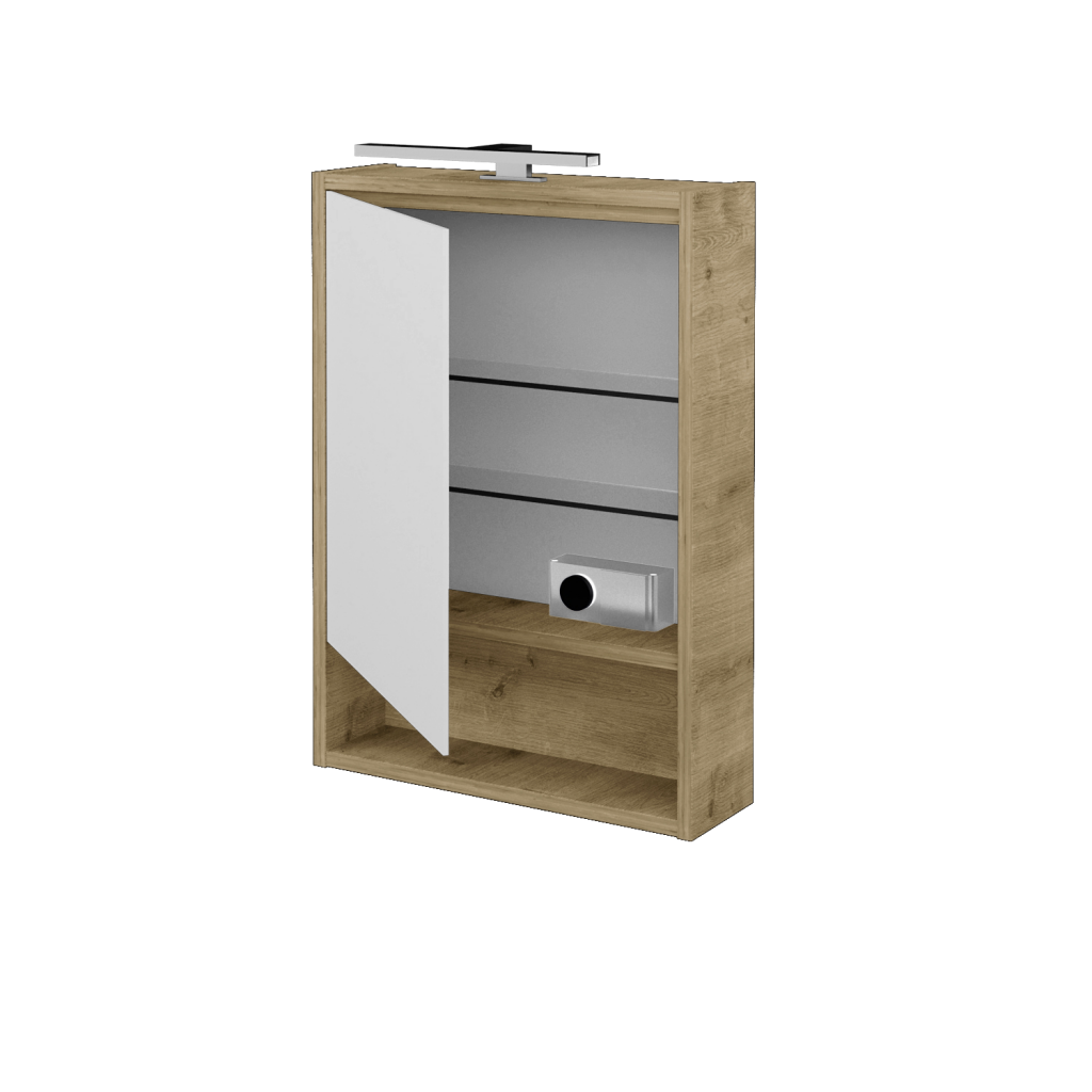 Nová definice prostoru Galerka FOCUS GAOE 50 je součástí nové řady galerek FOCUS s ojediněle řešeným úložným prostorem a celou řadou praktických detailů, které vám usnadní život v koupelně. Parametry Galerka FOCUS GAOE 50 je konstruována jako jednodveřová s oboustranným zrcadlem. Vnitřní prostor galerky je rozdělen pomocí 2 skleněných a nastavitelných polic, díky čemuž vzniká praktický prostor pro uložení všech doplňků, jako je kosmetika, hygienické potřeby atd. Velkou výhodou galerky je el. zásuvka 230 V (uvnitř galerky) a vypínač pro LED osvětlení Pino 300 (5 W, teplota 4 000 K). Galerka splňuje krytí IP 44. U galerky je rovněž možné vybrat, zda chcete pravé nebo levé otevírání. Povrchové zpracování Korpus galerky je možné vyrobit v 18 různých dekorech, v lakovaných provedeních (lesk/mat) nebo v individuální barevnosti dle vzorníku RAL/NCS. Výhody galerky: Možnost volby pravého nebo levého otevírání. Maximální zrcadlová plocha díky oboustrannému zrcadlu na dvířkách. Galeka je vybavena elektrickou zásuvkou, vypínačem a LED osvětlením Pino 300. Ve spodní části galerky je praktická otevřená nika.