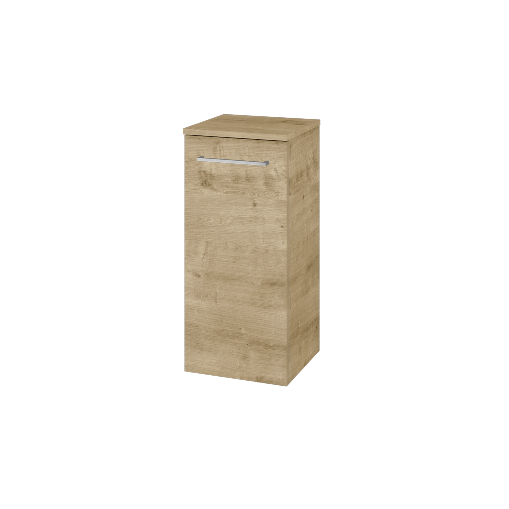 Nízká koupelnová skříň DOS SND 35 v závěsném provedení je vhodná do menších koupelen, jako doplněk k umyvadlovým skříním nebo samostatně, pro úložení ručníků, pracích prášků a jiných předmětů.  Parametry skříně Skříň DOS SND 35 je konstruována je jednodveřová, s vnitřním prostorem členěným 2 skleněnými nastavitelnými policemi. Výhodou dvířek je značkové kování Hettich s jemným a tichým dovíráním a celoživotní zárukou kvality. Současně si můžete vybrat, zda chcete levé nebo pravé otevírání. Do skříně si můžete také doobjednat prádelní koš. Dvířka lze otevírat pomocí několika typů úchytek:  T01 - matná oblá úchytka T02 - ocelová kulatá úchytka T03 - chromová hranatá úchytka T04 - chromová úchytka s lesklým povrchem T05 - chromová uchytka s lesklým povrchem možnost bezúchytkového provedení T31- Push to Open.  Povrchové úpravy Skříň vyrábíme v celé řadě dekorů, dřevodekorů a laků v provedení lesk/mat. Samozřejmostí je také úprava v provedení Individual dle vzorníku RAL/NCS. Sladění s ostatními skříněmi ve vaší koupelně nebylo nikdy jednodušší.  Horní plátek je vždy v barvě korpusu. Přednosti skříňky: kování značky Hettich dodáváme s celoživotní zárukou. skříň je konstruována pro zavěšení vedle koupelnové skříně nebo samostatně.