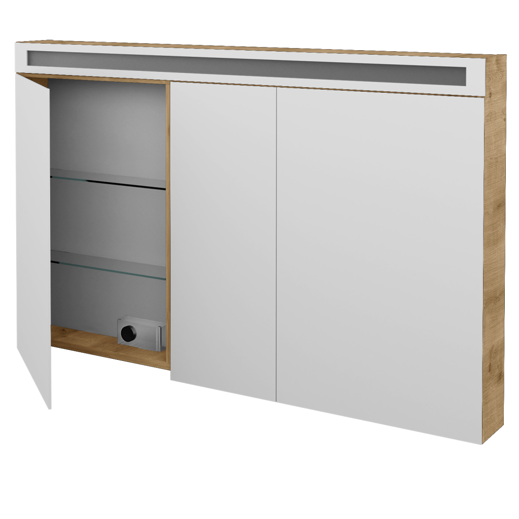 Zrcadlové skříně jsou oblíbené, elegantní a především velmi praktické. V Dřevojasu jsme se při jejich výrobě zaměřili na to, aby vám v zpříjemnily osobní hygienu a celkově zjednodušily život v koupelně. A přesně toto umí galerky řady AIR. Parametry galerky Zrcadlová skříňka AIR GA3OE 130 je vyrobena ve trojdveřovém provedení s oboustrannými zrcadly. Ta jsou ke korpusu připevněna pomocí značkových pantů Grass, které jsou k zrcadlům přichyceny pomocí speciální, patentem chráněné a v Dřevojasu zkonstruované, kovové lišty. Vnitřek galerky Vnitřní uspořádání galerky AIR je řešeno šesti poličkami vyrobenými z pevného skla. Tyto poličky lze umístit v šesti různých výškově nastavitelných pozicích. LED osvětlení LED osvětlení o výkonu 25,6 W je umístěno v horní části galerky, za zrcadlovou lištou s propískovaným sklem. Světlo se ovládá vypínačem ve spodní části vnitřku galerky, kde je také k dispozici externí i elektrická zásuvka (230 V). Galerka splňuje krytí IP 44. Povrchové úpravy Zrcadlovou skříňku AIR GA3OE 130 lze vyrobit v celé řadě povrchových úprav. Vybrat si můžete z mnoha dekorů, dřevodekorů laků (provedení lesk/mat) nebo možnost Individual dle vzorníku RAL/NCS. Přednosti galerky: Na galerku se vztahuje naše prodloužená záruka 5 let. Díky svému minimalistickému designu se galerka hodí k jakékoliv umyvadlové skříňce. Materiál korpusu je vyroben z kvalitních LTD desek. Galerka je vybavena úsporným LED osvětlením s výkonem 25,6 W. Oboustranné zrcadlo usazeno na značkových pantech. Dvířka jsou vybavena zrcadlovou lištou chráněnou patentem.