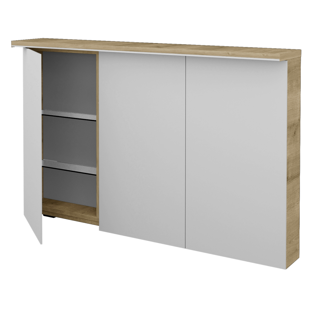 Součástí široké nabídky zrcadlových skříní je i elegantní a prostorná galerka ASTON GA3OE 120 vybavená praktickým LED osvětlením, vypínačem a velkým úložným prostorem. Galerka je díky svým rozměrům vhodná do středně nebo větších koupelen a lze ji kombinovat s jakoukoliv umyvadlovou skříňkou.  Parametry galerky Zrcadlová skříňka ASTON GA3OE 120 je konstruována jako třídveřová s oboustrannými zrcadly. Ta jsou uchycena ke korpusu pomocí značkových pantů Grass a speciální zrcadlové lišty, která je chráněná českým patentem. Korpus galerky vyrábíme z kvalitních LTD desek a můžete si vybrat z celé řady povrchových úprav. K dispozici jsou krásné dekory, dřevodekory nebo velice elegantní lakované úpravy lesk/mat. Galerku je také možné vyrobit v individuálním provedení dle vzorníku RAL/NCS. Uspořádání Zrcadlová skříňka ASTON GA3OE 120 má prostor rozdělený pomocí šesti skleněných polic, které lze umístit ve třech výškově nastavitelných pozicích.  LED osvětlení Součástí výbavy galerky je také LED osvětlení o výkonu 18 W (LED diody – světelný pásek nelze vyměnit). Oproti modelům galerek AIR a MAX je umístěno v předstupující rampě a zatímco u jmenovaných modelů svítí světlo do prostoru, u této galerky osvětluje prostor hlavně kolem umyvadla. Vypíná se pomocí vypínače ve spodní části galerky, kde je také umístěna i elektrická zásuvka (230 V). Galerka splňuje krytí IP 44. Přednosti: Na zrcadlovou skříňku dáváme prodlouženou záruku 5 let. Úsporné LED osvětlení o výkonu 18 W, které je ovladatelné vypínačem ve spodní části galerky. Součástí výbavy je i elektrická zásuvka. Díky oboustrannému zrcadlu nabízí galerka dvojnásobnou zrcadlovou plochu. Zrcadlová dvířka jsou ke korpusu uchyceny pomocí pantů značky Grass na speciální, patentem chráněné, liště.