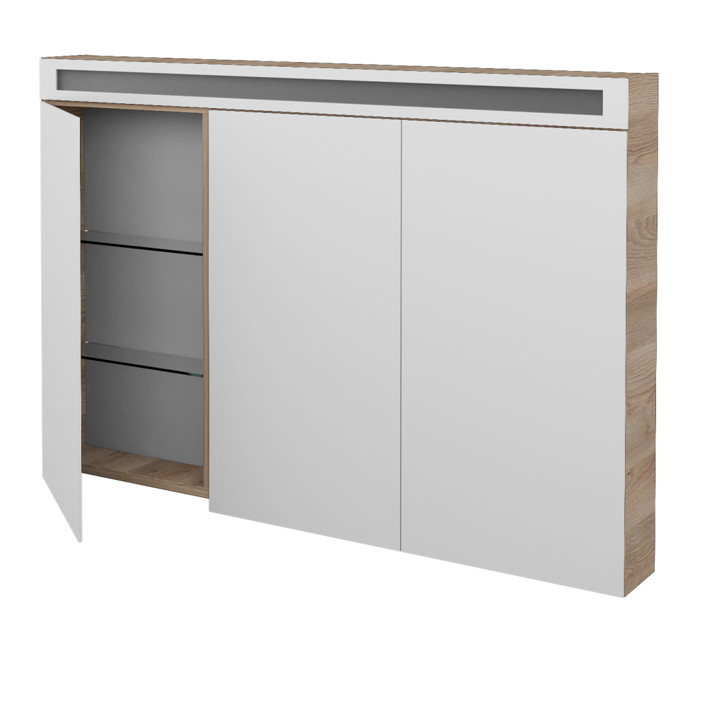 Zrcadlové skříně jsou oblíbeným prvkem v koupelnách, jsou elegantní a velmi praktické, díky čemuž nám ulehčí život v koupelně. Mezi takové patří i naše třídveřová galerka MAX GA3O 120 s LED osvětlením, která je vhodná především do velkých koupelen.  Parametry galerky Koupelnová galerka MAX GA3O 120 je vyrobena z kvalitních LTD desek, které lze upravit v celé řadě dekorů a jiných povrchových úprav. Přední část galerky je řešena oboustrannými a otevíratelnými zrcadly umístěnými na značkových kovových pantech Grass, které jsou k pantům přichyceny pomocí speciální zrcadlové lišty chráněné českým patentem. Vnitřek galerky Vnitřní uspořádání galerky MAX je řešeno šesti poličkami vyrobenými z pevného skla. Tyto poličky lze umístit v šesti různých výškově nastavitelných pozicích. LED osvětlení LED osvětlení je umístěno za zrcadlovou lištou v horní části galerky. Střední část této zrcadlové lišty tvoří průhledné, propískované sklo. Koupelnová galerka MAX GA3O 120 neobsahuje ovládání osvětlení. Světlo galerky se zapíná klasickým nástěnným vypínačem, kterému musí odpovídat stavební připravenost koupelny respektive umístění elektroinstalace. Shrnutí Materiál korpusu je vyroben z kvalitních LTD desek. Galerka je vybavena úsporným LED osvětlením s výkonem 24 W. Zrcadlová skříň splňuje krytí IP 44. Oboustranné zrcadlo usazeno na značkových pantech. Dvířka jsou vybavena zrcadlovou lištou chráněnou patentem. Vnitřní prostor je rozdělen pomocí šesti skleněných polic.