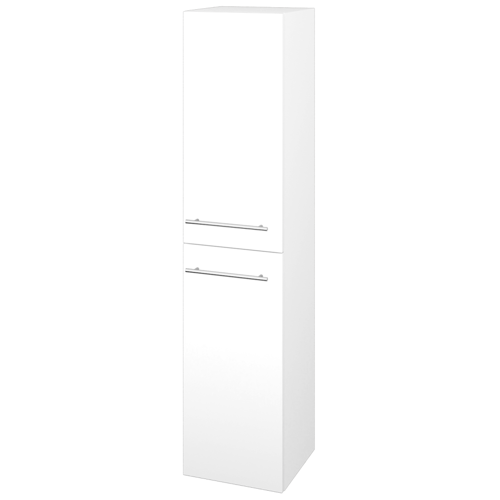Potřebujete další úložný prostor, ale nemátek dostatek místa v koupelně? Doplňková skříň DOS SVD2K 35 je úzká, takže ušetříte cenné místo, ale současně je prostorná a díky zásuvkám a výklopnému koši na prádlo i velmi praktická. Parametry skříně Skříň DOS SVD2K 35 je konstruována jako závěsná ve dvoudveřovém provedení a s prostorem, rozděleným na horní část se 2 skleněnými a nastavitelnými policemi a na spodní část s výklopným košem na prádlo. Dveře mají kování značky Hettich s jemným a tichým dovíráním a můžete si zvolit, zda chcete levé či pravé otevírání. Dvířka se otevírají pomocí úchytky. Vybírat můžete ze sedmi typů:  T01 - matná oblá úchytka T02 - ocelová kulatá úchytka T03 - chromová hranatá úchytka T04 - chromová úchytka s lesklým povrchem T05 - chromová uchytka s lesklým povrchem T06 - černá mat T07 - černá mat Povrchové úpravy Skříň vyrábíme v celé řadě dekorů, dřevodekorů a laků v provedení lesk/mat. Samozřejmostí je také úprava v provedení Individual dle vzorníku RAL/NCS. Sladění s ostatními skříněmi ve vaší koupelně nebylo nikdy jednodušší.  Přednosti skříňky: Kování značky Hettich dodáváme s celoživotní zárukou. Ve spodní části je praktický a objemný prádelní koš. Tato koupelnová skříň je závěsná, lze k ní přikoupit kovové nožičky.